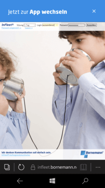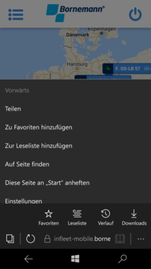 Wenn du Windows benutzt, öffnest du den Internet Explorer, gehst auf die Website infleet-mobile.bornemann.net, ziehst da die App-Leiste von unten hoch und tippst zum Schluss auf den Stern und die Stecknadel.